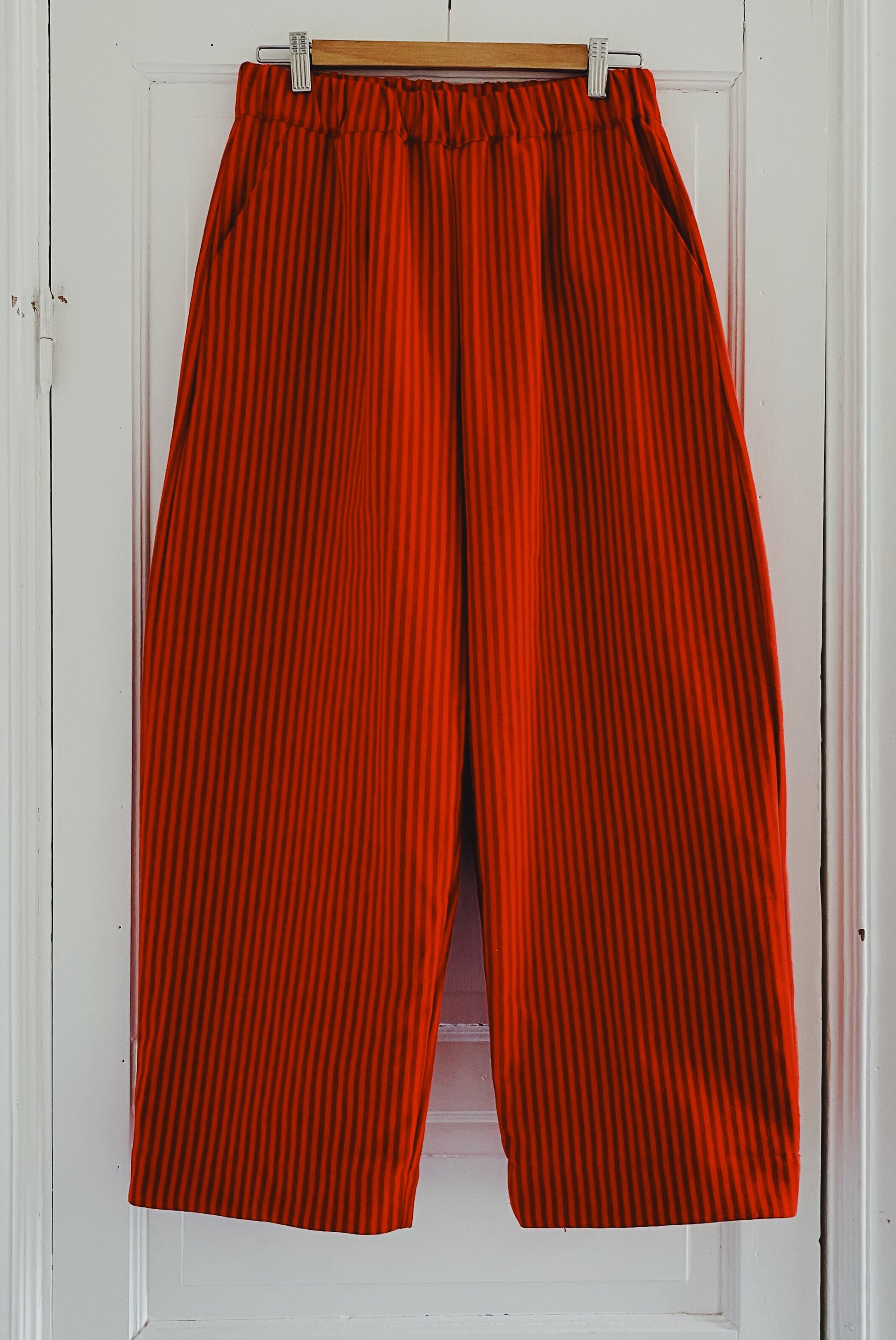 This version is made out of a vintage cotton canvas in beautifully vibrant red stripes - a pair that truly lifts up every neutral outfit. Because this is a vintage fabric loomed on a narrow loom these pants are only available in size 1 and 2.